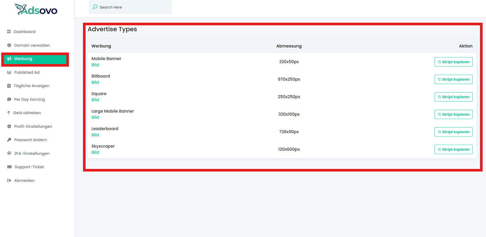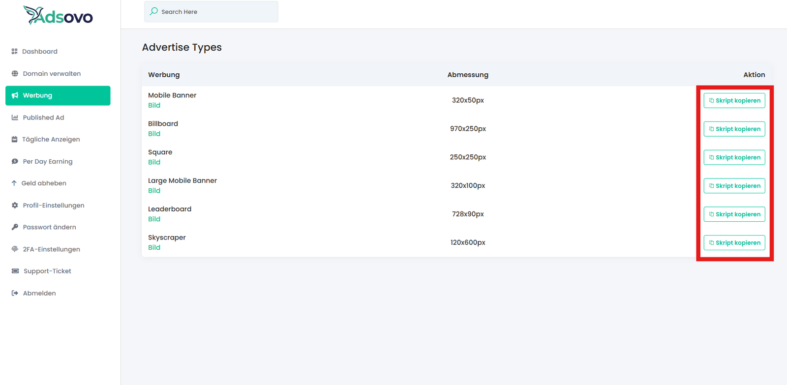 Nachdem Sie Ihre Domain bei Adsovo verifiziert haben, können Sie Werbeanzeigen auf Ihrer Website einbinden. Das geht ganz einfach über das Dashboard.